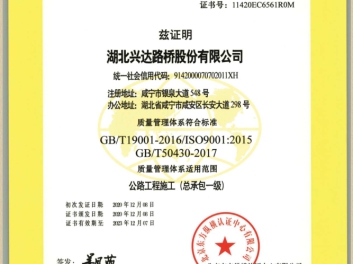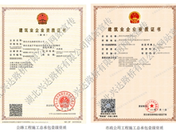 湖北興達路橋有限公司成立于1998年3月,是國家住建部、省住建廳批準的具有公路工程施工總承包壹級、市政公用工程施工總承包壹級、橋梁工程專業(yè)承包壹級、公路路面工程專業(yè)承包壹級、公路路基工程專業(yè)承包壹級、隧道工程專業(yè)承包貳級、地基基礎工程專業(yè)承包貳級、環(huán)保工程專業(yè)承包貳級、公路交通工程(公路安全設施分項)專業(yè)承包貳級資質(zhì)的施工企業(yè)。