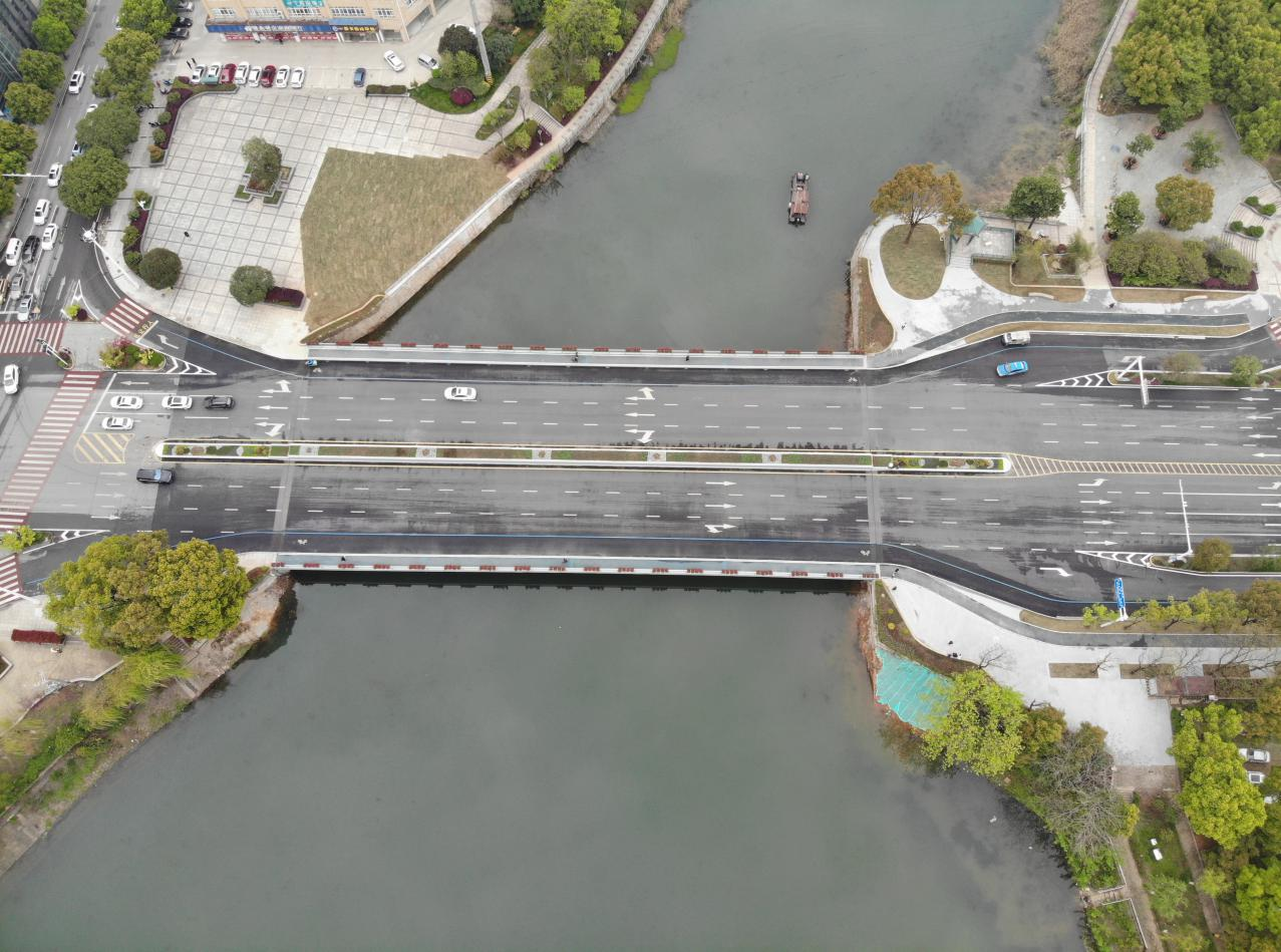 丹桂橋位于咸寧大道中段,橫跨淦河,連接濱河?xùn)|路、玉泉街,是市區(qū)交通重要路段。為了保證最大程度減輕對現(xiàn)有交通的影響,首次在我市橋梁施工中采用一體式換梁施工工藝,新、舊橋面通過頂升橫移技術(shù)“空中漫步”近40米,成功完成新舊橋梁的替換。改造后,橋面由32米拓寬到34.5米,原來的混凝土結(jié)構(gòu)置換為鋼結(jié)構(gòu),整體重量輕了40%,有效減小了橋梁上部結(jié)構(gòu)的恒載,橋梁荷載由原汽-20提升至城-A,提高了橋梁的通過性。