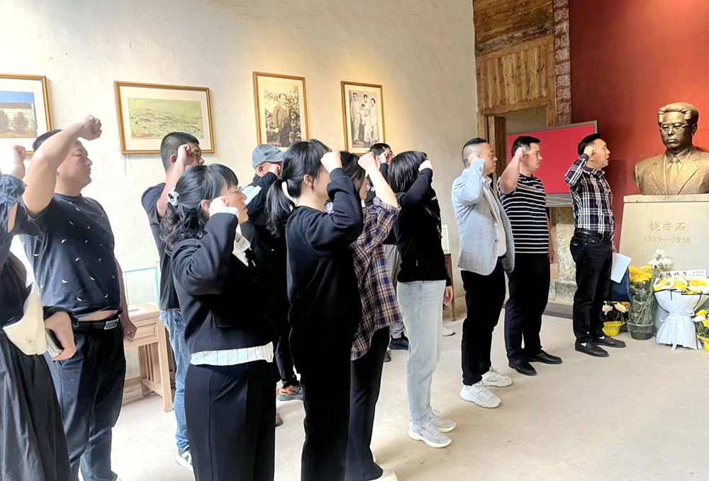 在氣勢磅礴的革命先烈雕像前,全體黨員懷著無比崇敬的心情整齊列隊(duì),向革命英烈敬獻(xiàn)花籃和鮮花,并鞠躬致敬、深切默哀,以此向?yàn)槊褡濯?dú)立、國家富強(qiáng)、人民幸福獻(xiàn)出寶貴生命的革命烈士寄托深切哀思。隨后,在鮮紅的黨旗下,全體黨員,重溫入黨誓詞,并集體參觀了錢亦石故居,事業(yè)部黨支部書記、經(jīng)理舒美華同志以“紅色教授錢亦石”為題,現(xiàn)場給全體黨員上了一堂堅(jiān)定理想信念的黨課,他號召黨員干部要以此瞻仰為契機(jī),要學(xué)思結(jié)合、知行合一,把紅色精神永遠(yuǎn)傳承下去,不斷從革命先烈身上汲取精神力量。要始終銘記黨的宗旨,繼續(xù)發(fā)揚(yáng)艱苦奮斗精神,在平凡的工作崗位上創(chuàng)造不平凡的業(yè)績。